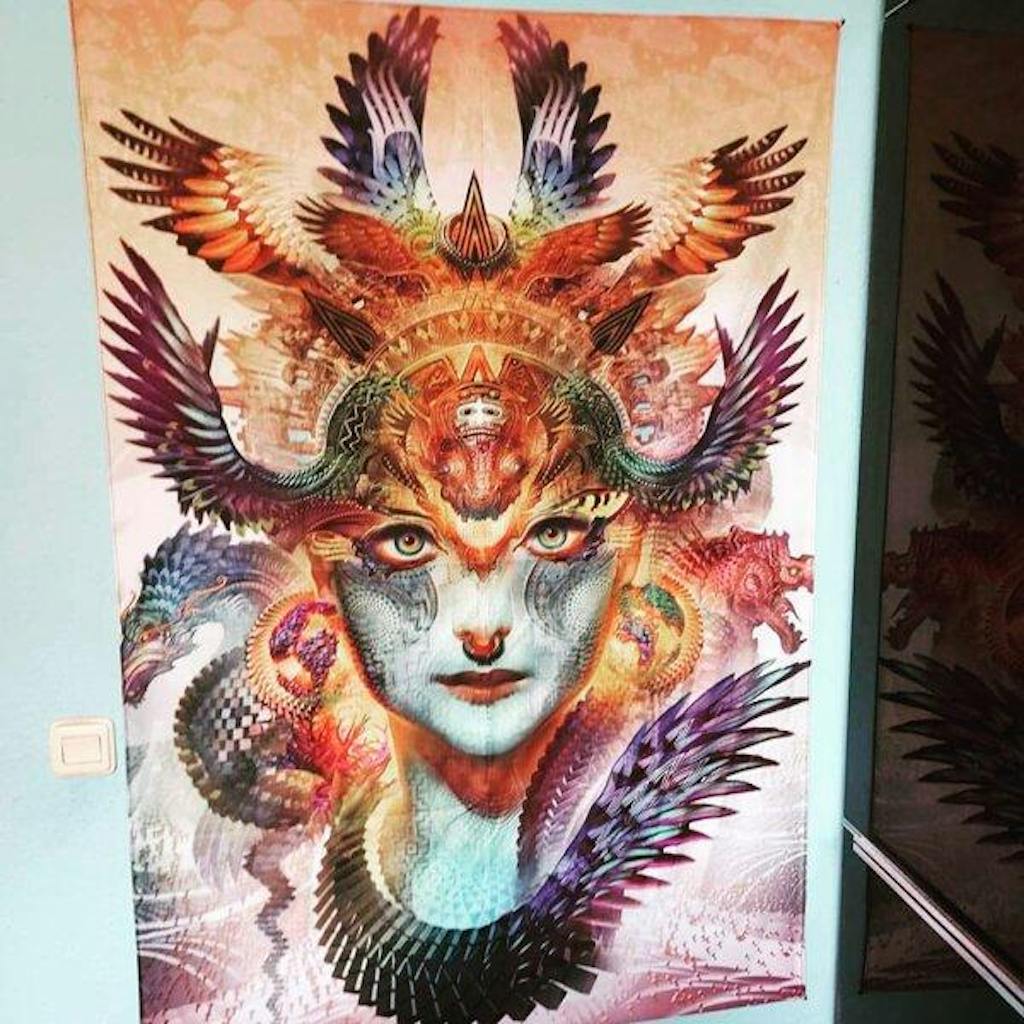 After running into Android Jones at Burning Man 2014, I have always had his work on my radar. With several bad experiences with ten or fifteen dollar tapestries from other online sites, I was worried about spending so much here at Third Eye on a piece of work by Android Jones that I love: Dharma Dragon. This year being what is was, I figured I may as well take the risk. I am so impressed with this tapestry: it's physical quality, the size, the color, and the intensity it brings. Whereas other cheap tapestries sag in a more parabolic form across the middle (I was worried about this for her face), this material is higher quality (you could take it to the beach or something if you'd like) and is more uniform when hung than other lower quality variants. I will definitely order from Third Eye again and am so happy I finally pulled the trigger on a lovely piece by one of my most favorite artists.